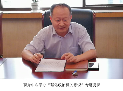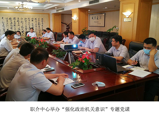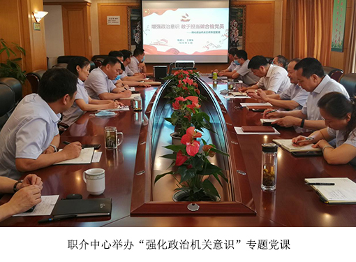 “七一”前夕,为贯彻市人社局2020年党建工作会议精神,抓实“不忘初心、牢记使命”制度建设,引导广大党员树牢“四个意识”、坚定“四个自信、做到“两个维护”, 6月29日下午,郑州市职业介绍中心在中心市场六楼会议室举办“强化政治机关意识”专题党课。职介中心党委书记王保华以《增强政治意识,敢于担当做合格党员》为题,为中心党员干部职工讲授了专题党课。中心班子成员及各科室、支部负责人共20人参加了学习。