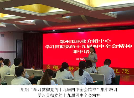 为深入学习贯彻党的十九届四中全会精神,按照市委组织部干部教育处和市人社局安排部署,8月14日下午,郑州市职业介绍中心组织中心全体干部职工在中心市场六楼会议室集中观看“贯彻党的十九届四中全会精神”视频。