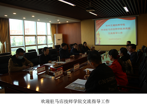 2020年10月21日上午,驻马店技师学院副院长杨海虹,财务科长李敬伟,人事科长梁爱丽,培训科长张苹,人事科科员王珂一行至郑州交通技师学院交流学习,学院院长张道勇,副院长许银莲、朱雪芳及相关处室负责人出席接见了5位来宾。