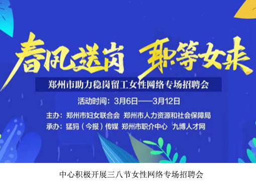 为进一步推动“春风行动”,拓宽我市妇女同志就业创业渠道,助力女性实现高质量就业,在“三八”妇女节来临之际,由郑州市妇女联合会、郑州市人力资源和社会保障局主办,郑州市职业介绍中心、猛犸(今报)传媒、九博人才网承办的“春风送岗 职等女来”郑州市助力稳岗留工女性网络专场招聘会于3月6日至12日在中部就业网盛大开启,为绿城巾帼们送上一份别样的节日礼物。