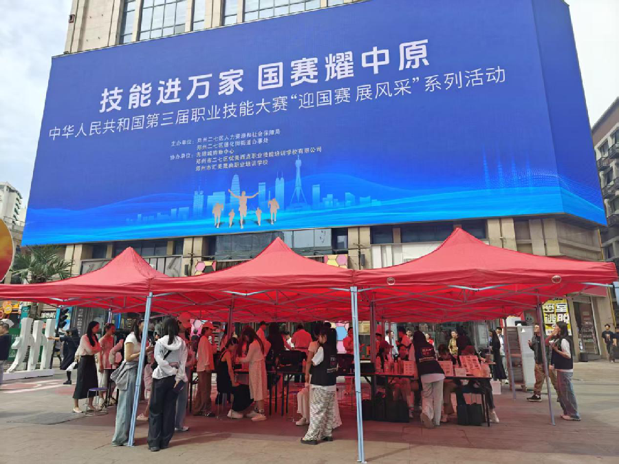 活动现场设置了西式面点、美容化妆等多个技能展演专区。二七区优美西点职业技能培训学校的师生现场展示法式马卡龙制作、裱花蛋糕装饰等技艺,将烘焙过程转化为视觉艺术表演;郑州市汇美晟典职业培训学校的美妆团队则通过模特现场改妆,生动演绎日常妆面与舞台妆的技法转换。两所职业院校的师生还设置了体验教学区,手把手指导市民制作简易西点、体验美甲彩绘等基础技能,让市民亲身体验并感受乐趣。