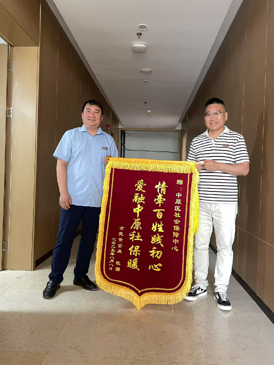 近日,中原区人社局收到群众黄先生送来的一面锦旗,“情牵百姓践初心 爱融中原社保暖”十二个字,既是对工作人员的肯定,也道出了社保服务的温度。