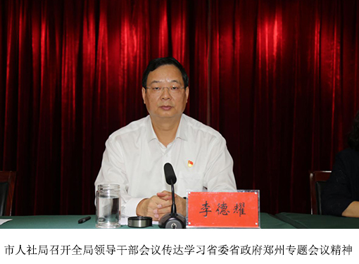 李德耀强调,贯彻落实好省市两级会议部署和市委两个文件精神,全局广大党员干部特别是各级领导干部必须保持奋发有为的精神状态,把服务郑州国家中心城市建设作为一项重大政治任务,把造福广大市民群众作为一项重大政治责任,努力做到学在深处、谋在新处、干在实处、走在前列。一是学在深处,提高政治站位,深入学习贯彻习近平总书记关于河南、郑州系列重要讲话和指示精神,通过学习找准定位、站稳立场、明确方向;二是谋在新处,提高发展质量,从人社事业发展的攻坚克难中,在上情和下情的结合中,找准工作决策与民情民意的最佳融合点,找准工作部署与服务发展的最佳切入点,谋工作新思路,推工作新举措,创工作新业绩;三是干在实处,提高执行成效,大力弘扬劳动精神、劳模精神、工匠精神,让崇尚实干、狠抓落实的精神融入每名党员干部的血液中,以实干促发展,以实干论英雄。聚焦关键环节,突出重点工作,持续加大力度保就业、稳企业、强化招才引智工作、抓好营商环境优化、劳动者权益维护等工作。