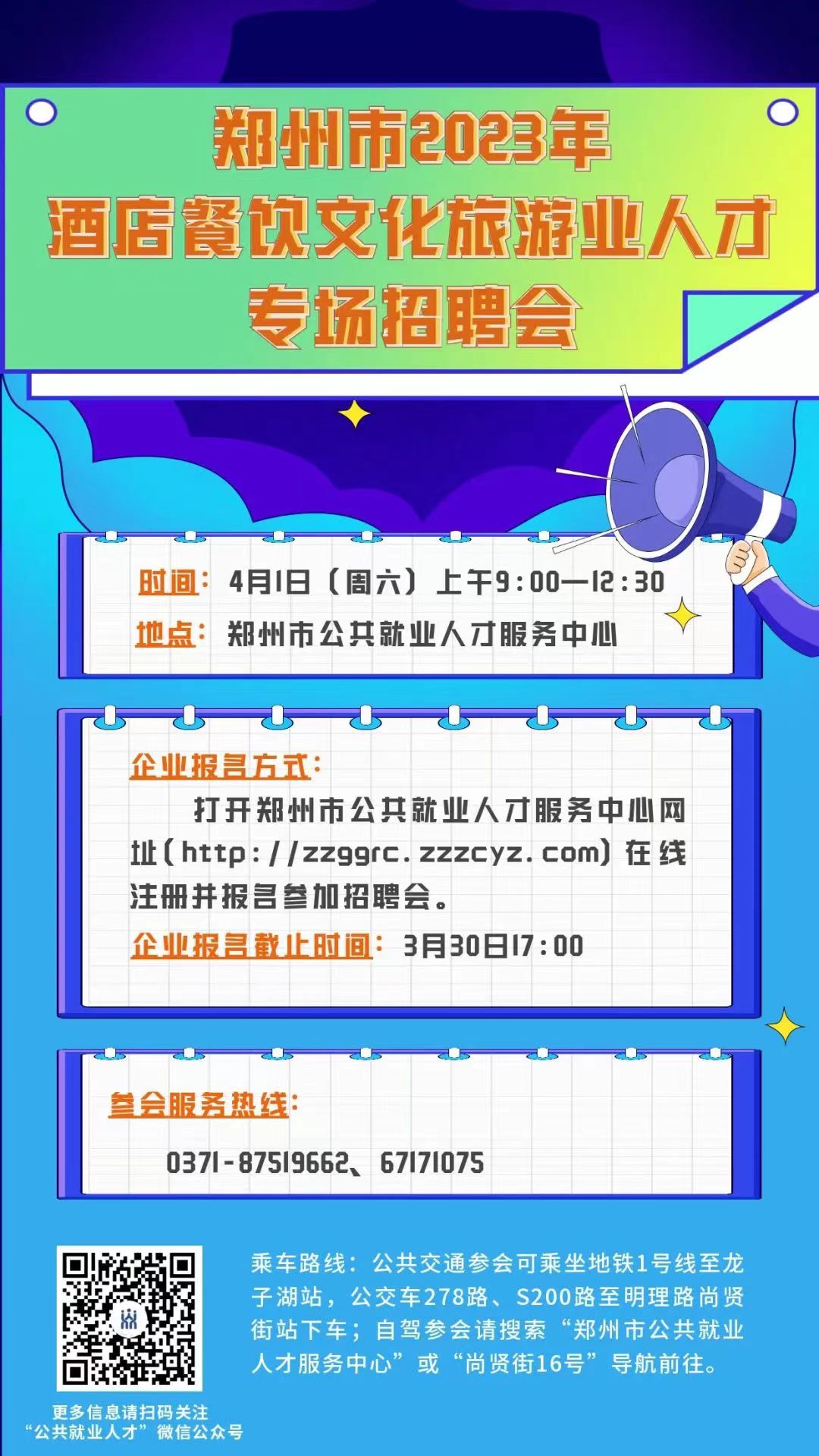 为搭建酒店餐饮旅游行业人才供需平台,更好助力酒店餐饮文化旅游业拉动经济社会发展,在旅游旺季到来之际,郑州市2023年酒店餐饮文化旅游业人才专场招聘会将于4月1日(周六)上午9:00—12:30在郑州市公共就业人才服务中心举办。