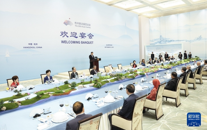 9月23日中午,国家主席习近平和夫人彭丽媛在浙江省杭州市西子宾馆举行宴会,欢迎来华出席杭州第19届亚洲运动会开幕式的国际贵宾。