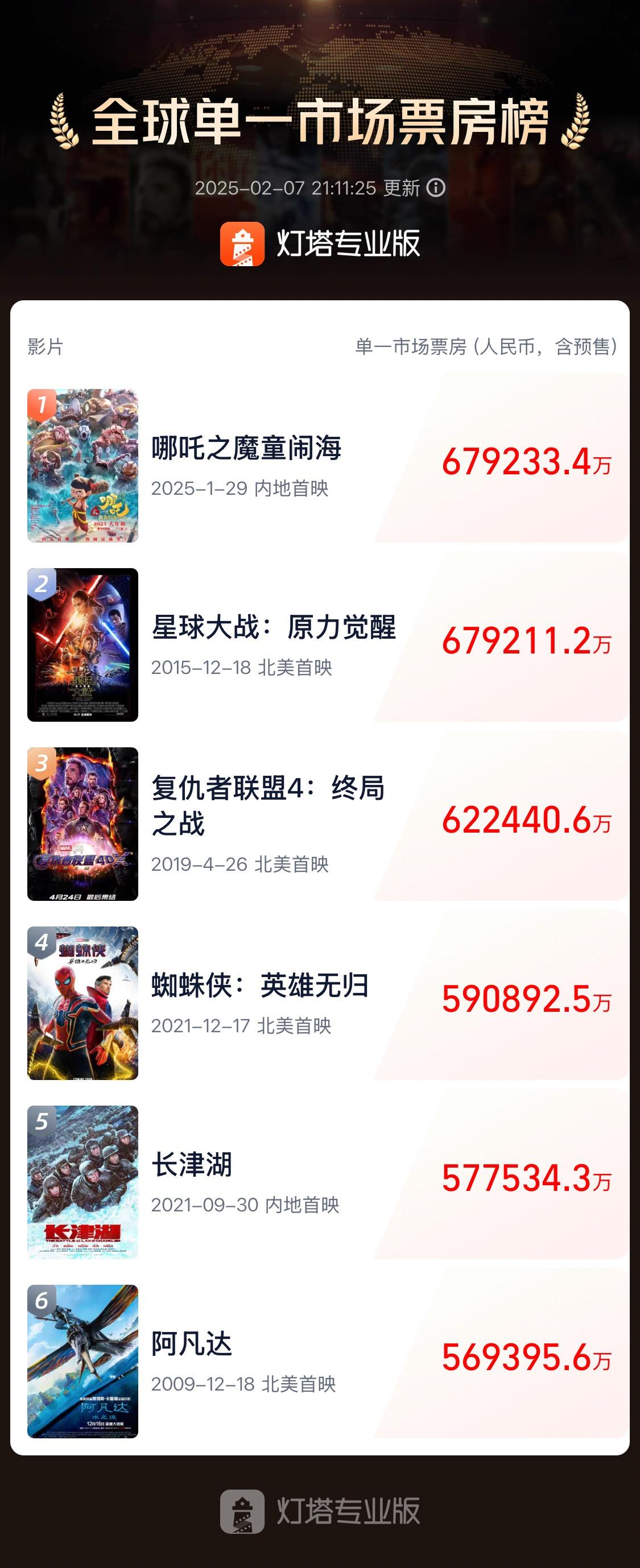 据网络平台数据,截至2月7日21时,电影《哪吒之魔童闹海》票房(含预售)突破67.922亿,超过《星球大战:原力觉醒》票房成绩,登顶全球影史单一市场票房榜!