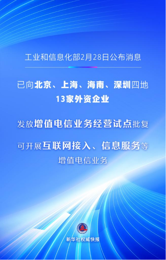 新华社北京2月28日电(记者张晓洁、张辛欣)记者2月28日从工业和信息化部获悉,工业和信息化部近日已向北京、上海、海南、深圳四地13家外资企业发放增值电信业务经营试点批复。相关企业按照批复内容,可开展互联网接入、信息服务等增值电信业务。