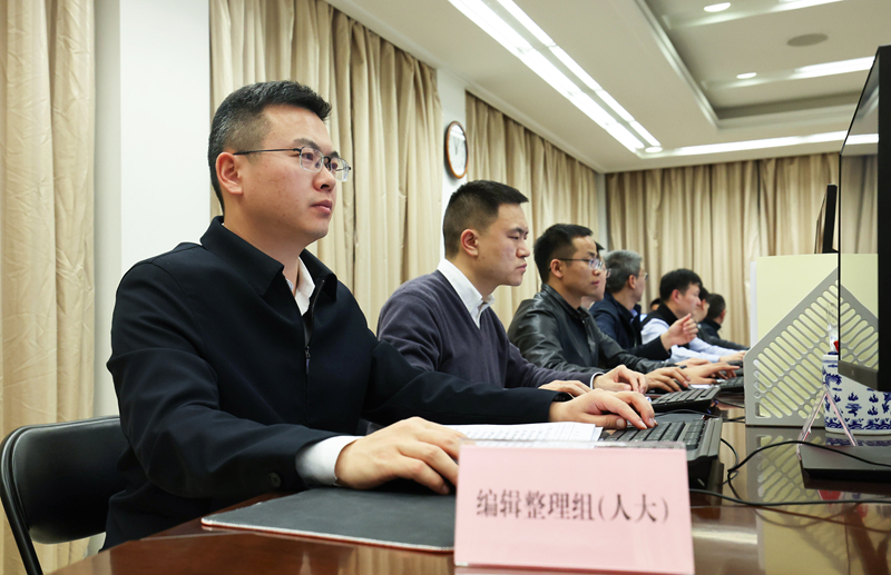 3月5日,工作人员对材料进行审核汇编。今年全国两会期间,国务院办公厅和国务院有关部门继续派出工作人员开展旁听两会工作,通过全面记录、汇总转办、高效回应代表委员意见建议,搭建起政府听取民意、汇聚民智的桥梁,及时将代表委员的真知灼见吸收转化为做好政府工作的硬招实招。新华社记者 卢烨 摄