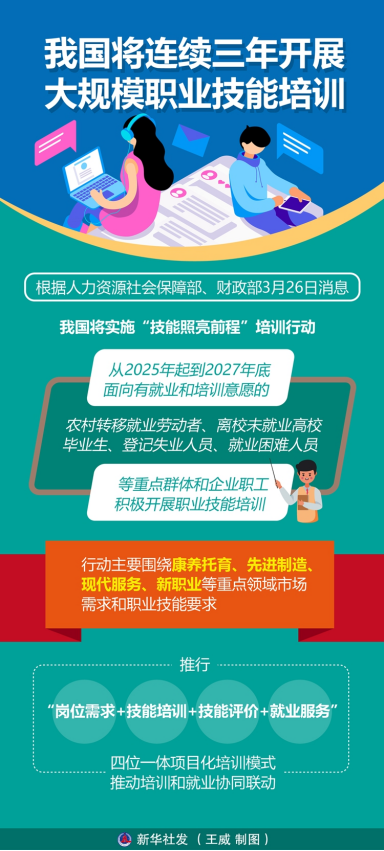 新华社北京3月26日电(记者姜琳)根据人力资源社会保障部、财政部26日消息,我国将实施“技能照亮前程”培训行动,从2025年起到2027年底,面向有就业和培训意愿的农村转移就业劳动者、离校未就业高校毕业生、登记失业人员、就业困难人员等重点群体和企业职工,积极开展职业技能培训。
