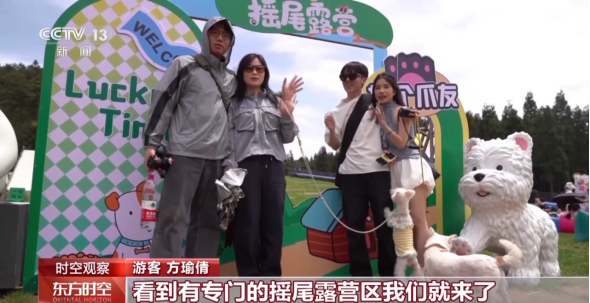 游客 方瑜倩:以前带狗狗出游总担心没地方去,看到有专门的摇尾露营区,我们就来了,这里还准备了拍照道具和宠物零食,也能认识很多朋友。