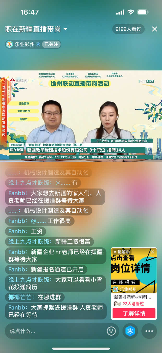 郑州市就业创业服务中心依托“乐业郑州”抖音号、微信视频号、支付宝生活号将新疆多地的优质就业资源全景式呈现给本地求职者。直播中,新疆就业工作人员系统介绍了当地的城市环境、产业发展及完善的社会保障体系,从生活配套到发展前景,为屏幕前的求职者勾勒出立体的新疆就业图景。此次活动直播观看量达49935人,“乐业郑州”抖音直播间上架涵盖软件工程师、操作工、安全员等13个就业岗位,共计划招聘103人,求职人数166人,达成初步意向人数45人。