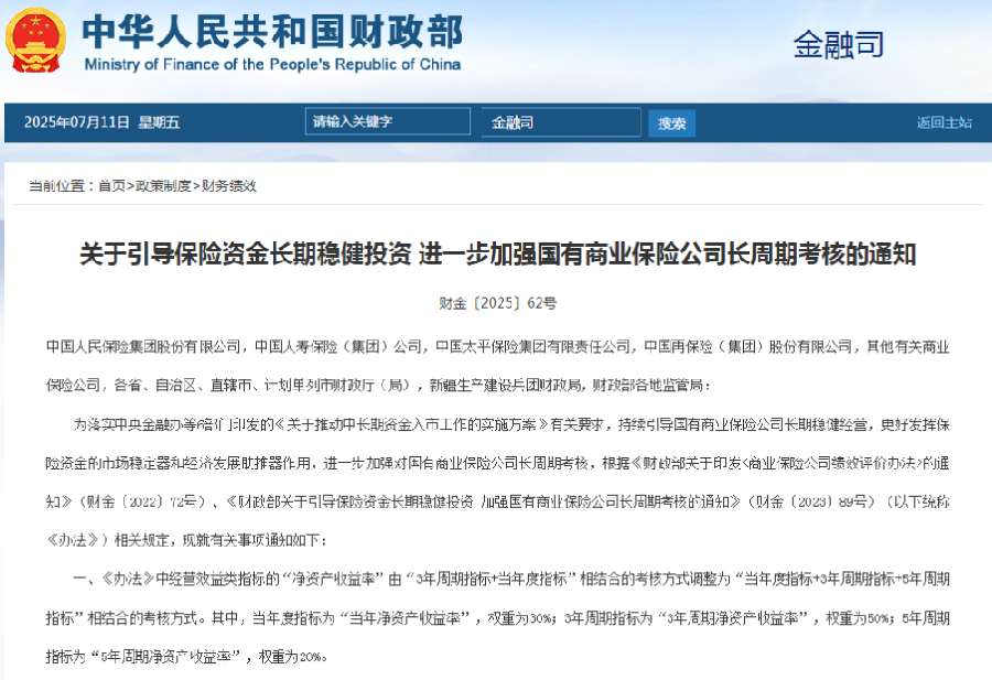 7月11日,财政部公布《关于引导保险资金长期稳健投资 进一步加强国有商业保险公司长周期考核的通知》,升级国有商业保险公司绩效评价标准,全面建立三年以上长周期考核机制,实现了重要的制度性突破。