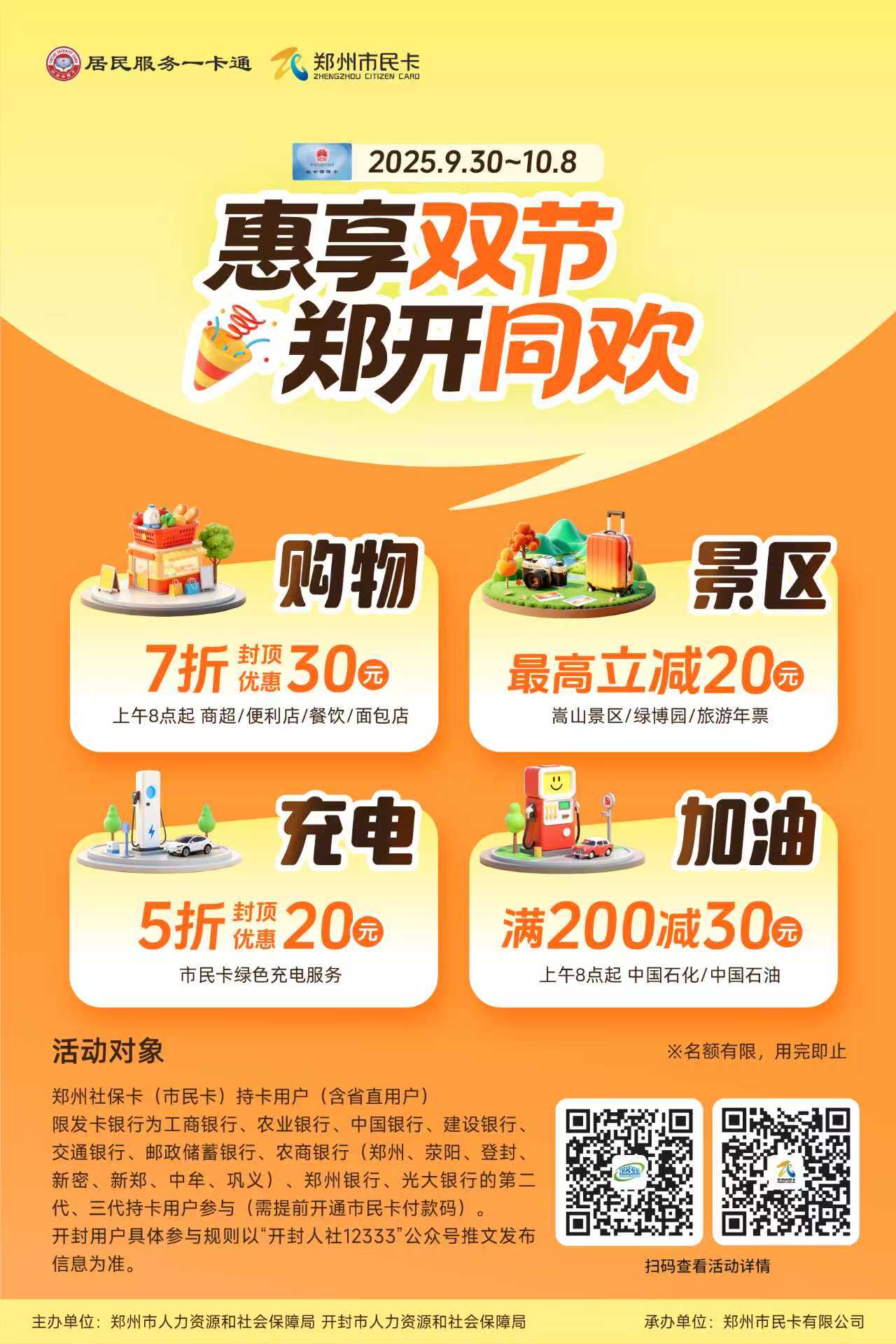 据了解,活动期间,郑州社保卡持卡(含省直)用户,通过郑州市民卡APP完成市民卡绑定并开通市民卡付款码,在郑开两地参与活动的加油站、商超餐饮门店以及部分景区内店铺扫码支付即可享受优惠立减,其中加油满200元减30元,商超餐饮可享7折优惠(最高立减30元);在郑州市民卡APP智能充电服务中进行预充值,可享5折优惠(最高立减20元)。另外为契合双节出游这一消费习惯,在郑州市民卡APP购买嵩山景区各景点门票可享5折优惠,单笔最高减20元,活动覆盖少林寺、嵩阳书院等热门景点,购买绿博园门票、郑开旅游年票、开封旅游年票、天下黄河•河南旅游年票可享“立减10元”优惠。以上各类优惠每位用户活动期内可享一次,且各类活动优惠名额有限,用完即止。郑州社保卡(含省直)持卡用户在参与活动前可通过郑州市民卡APP首页活动专区查看具体参与门店及活动细则,开封社保卡持卡用户可通过“开封人社12333”微信公众号了解活动参与详情。