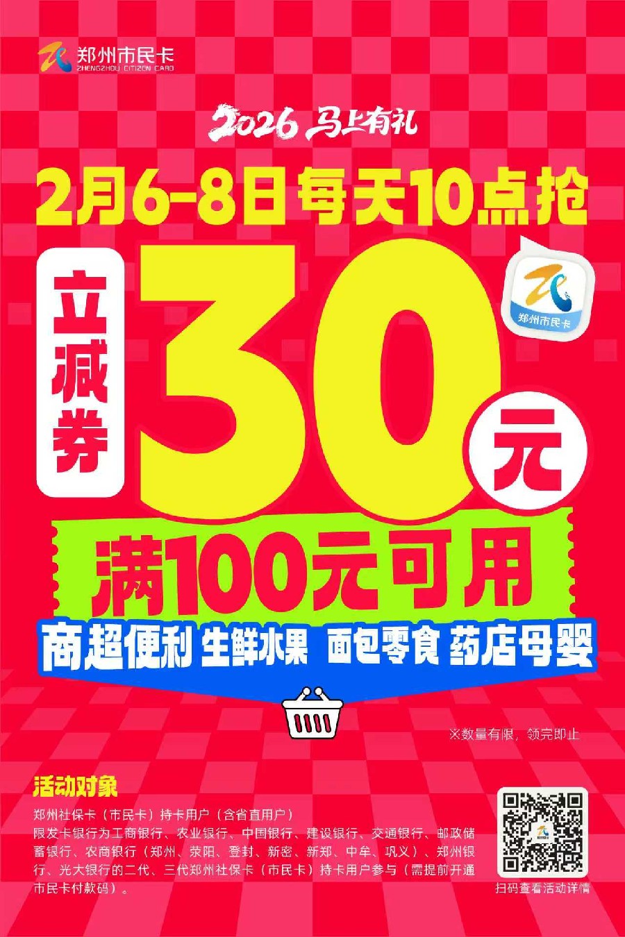 马上有礼,惠迎新年!此次新春消费券发放旨在营造热闹红火的节日氛围,让广大市民在新春佳节来临之际乐享实惠。2026年郑州社保卡(市民卡)将聚焦商超购物、文化旅游、公共出行、校园生活等多个领域,推动便民惠民服务常态化、精准化,切实增强群众的获得感与幸福感。
